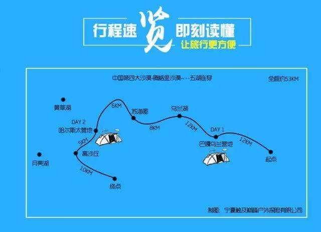 银川→阿拉善→腾格里沙漠→徒步12km→天鹅湖→天鹅湖宿营→大漠日出→徒步25km→太阳湖→太阳湖露营→大漠日出→徒步5km→高沙丘→徒步12km→出沙漠→银川