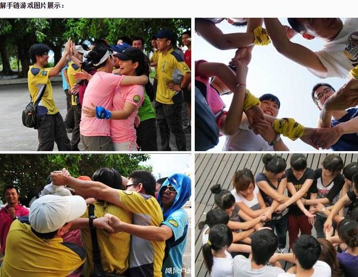 解手链互动游戏,10 人一组为最佳 时间:20 分钟 适合对象:全体人员 活动目的:让队员体会在解决团队问题方面都有什么步骤,聆听在沟通中的重要性以及团队的合作精神。