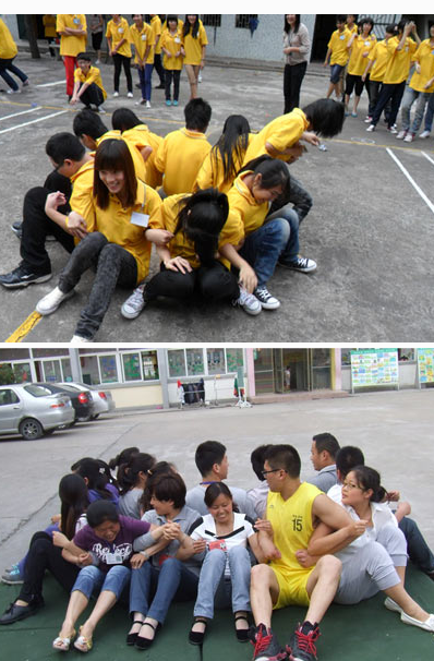 1、四人一组背对背的坐在地上,必须是屁股贴地的坐下,然后,相互间挽着胳膊,一起站起来。成功后在加入两个人,就是6个人坐地起身,大家相互配合,看看最多可以多少人成功起身。