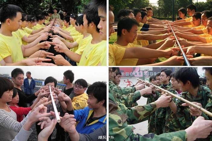 4、要求小组成员将齐眉棍保持水平,小组的任务是:在保证每个人的手都在齐眉棍下面的情况下,将齐眉棍完全水平的往下移动。一旦有人的手离开齐眉棍或齐眉棍没有水平往下移动,任务就算失败。