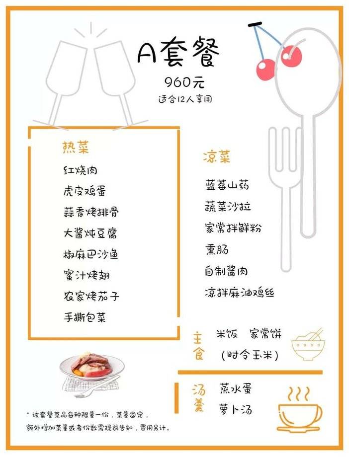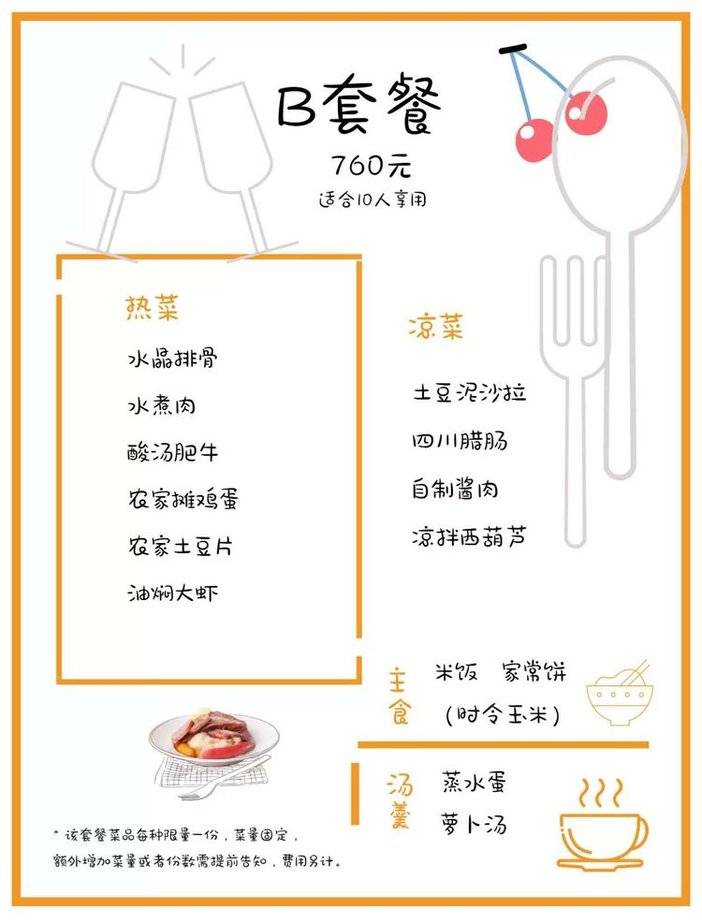有以下A、B两个套餐可供选择,适合10-12人享用,阿姨会选用当地最新鲜的食材,为您烹饪一桌好菜。