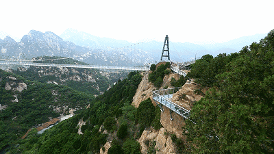 清凉谷玻璃栈道和树尖上的玻璃长廊,建在景区海拔1000多米的最高峰:“九重天”之上,宛若一条青龙盘桓在悬崖绝壁之上。当您走在玻璃栈道上,好似在空中漫步。其中,两个伸出悬崖绝壁数米多远的巨型玻璃观景平台,如同悬浮于空中,脚下如同踏在了朵朵白云之上。