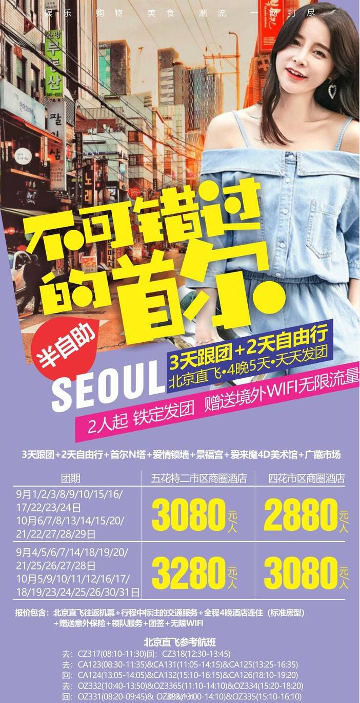 3、北京直飞首尔 入住市区哦 3+2 3天跟团 2天自由行哦