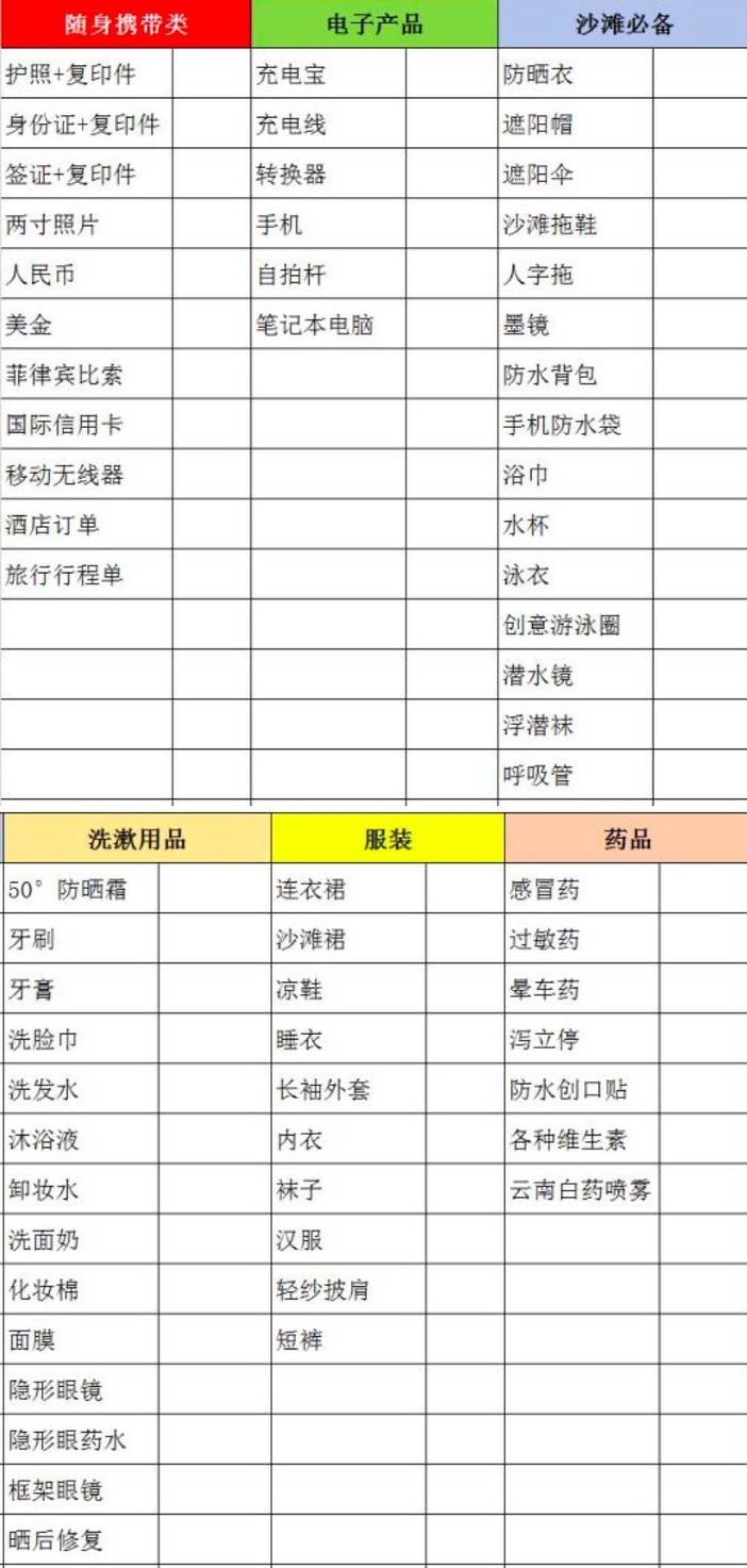 驱蚊剂、创可贴、防中暑药、治腹泻药品、退烧药、镇痛药,防过敏药,包括小型便携的急救包,长滩岛 生病了会很麻烦,必须先看医生,有医生开的处方单才能买到药。