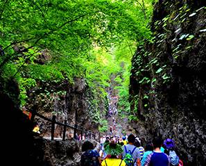 置身其谷,步游路随山峰而转,溪水绕游路而行,山水相依,植被茂密,空气清新,世间无比。游在其中,头顶绝壁万仞、蓝天一线;脚踏鹅卵石甬路,还可足疗保健;路边泉水叮咚、碧水清潭;身旁高山飞瀑、涧流潺潺;崖壁上灌木成林、青檀倒挂悬,独根草、野海棠和羊齿兰犹如墨彩涂于壁间,密如绿毯。