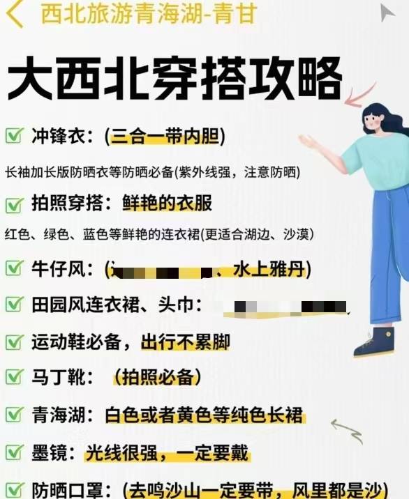 - 外套:携带一件轻薄的防晒衣,方便在白天阳光强烈时穿脱。颜色可选择白色、浅蓝色等浅色系,既能反射阳光又能与西北的自然景观相融合。