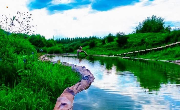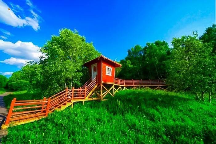 七彩森林占地23000多亩,具有草原、森林、湿地、丘陵、湖泊等丰富的自然资源,森林覆盖面积在80%以上。木栈道全程大约3公里,边走边看,一路走下来走了近两个小时,抵达天境湖时,太阳已经快要落山了,夕阳映照着朵朵云霞,远处的绿色与天际接壤,景色令人陶醉。