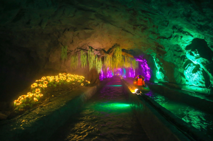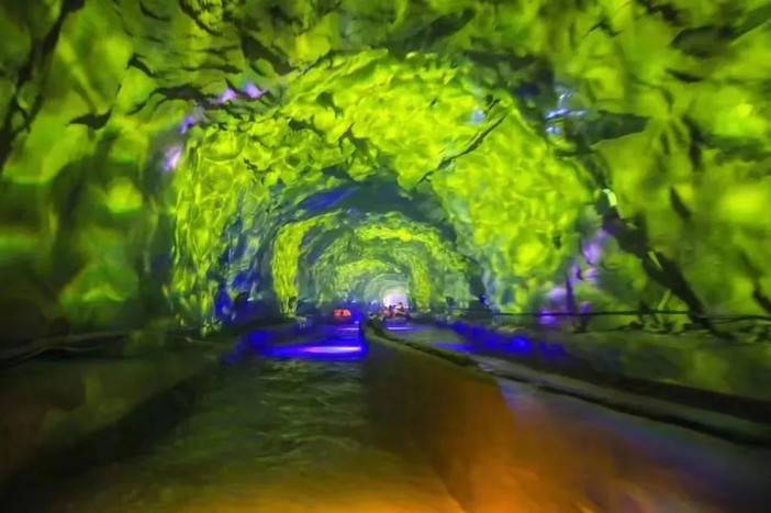 第二部分为平漂部分,游客沿天然河道顺流而下,河道全长6.8公里,中途还有一条1800米长的平漂隧洞,缤纷多彩的镭射灯打造了荷塘月色的美景,火树银花,霓虹璀璨。又似梦境仙踪,仿佛漫游在奇幻的海底世界。随着水流蜿蜒,橡皮艇行进在幽深的山洞中,水流时而宁静,时而湍急,人们时而陡然陷入漩涡中,时而又冲进浪头里。