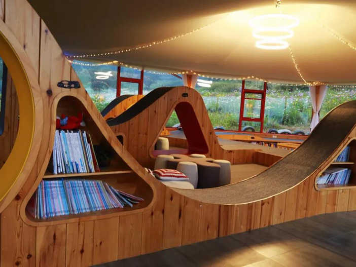 “丘壑起伏,形同山质”的书架,也为孩子的游乐场;上万本儿童读物,中外古今,包罗万象;安静的亲子阅读时光,愉快的亲子手工体验。这里环空间很大,四周玻璃窗,一侧为花海,一侧为草坪,有图书有乐高,大人不可以进入,有专人负责看护,提供托管服务。