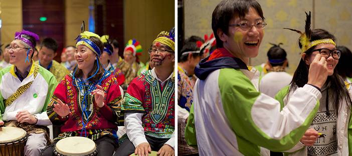 利用非洲文化的口号、节奏、气势、默契,在拍打节奏中去磨合,达到完美融合。
