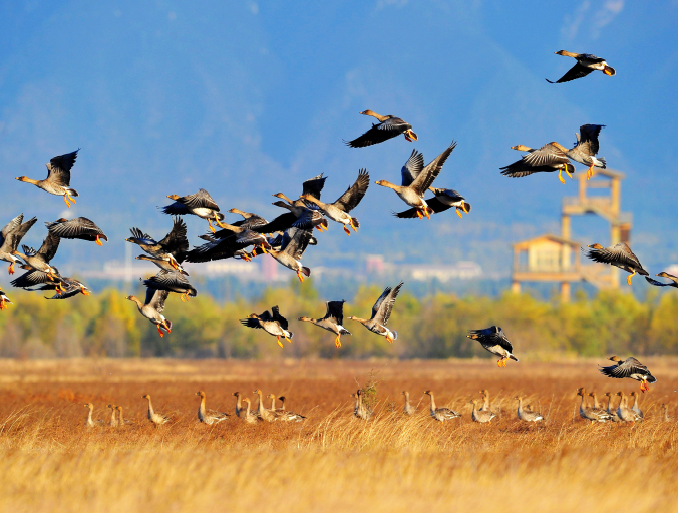 最经典的拍照地就是望湖楼了,不需要航拍器,登上望湖楼,就可以拍出各种大片!这里也是鸟瞰湿地的最佳观景处。