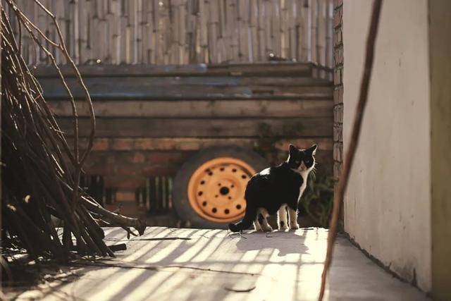 转过街角,一只“八字脸”的田园猫,正凝望着我。据说这种“正八字脸黑白花的田园猫”,智商高、脾气好、爱粘人,是动画片《黑猫警长》的原型。