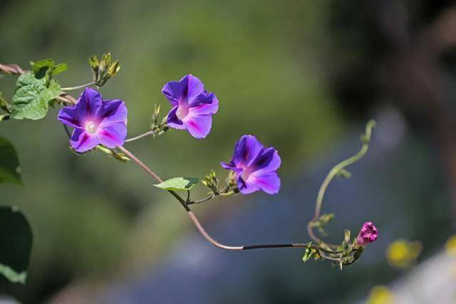 牵牛花有白、玫红、莹蓝等色,有的品种花还会带有白边。而同一株上的花朵也呈现出不同的颜色,这与花青素有关。紫外线可增加花青素含量,高温会使花青素降解。这种蓝色圆叶牵牛,一天的不同时段会呈现不同的颜色,刚吐露芳华的时候颜色会偏蓝,而随时光流逝则会变成洋红色。