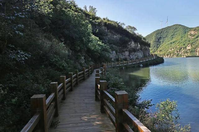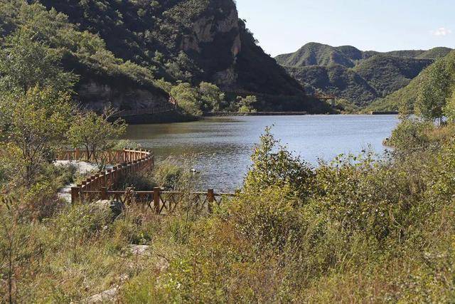长峪城木栈道,沿耸立的石山和水库顺势而建,被包围在一片茂密森林中,鸟语花香。