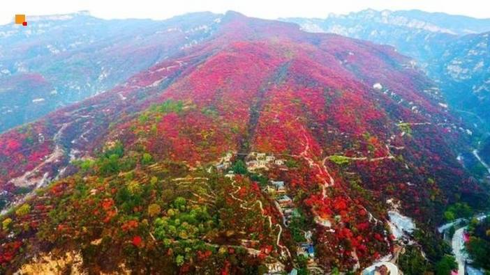 红叶密度堪称华北第一的坡峰岭,核心观赏区达两千余亩,每年秋天,二十万株野生黄栌恍若一幅繁茂磅礴的秋景油画。