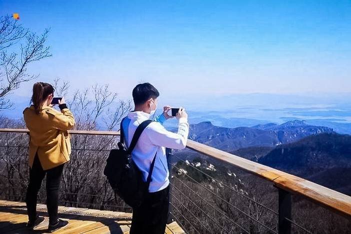沿着登山道一路上山,就可以登上青空岭,在这里云蒙山景区的风光一览无遗。风光无限好的同时也请不要错过位于山顶的云顶泉水咖啡厅,在那可以享受到由天然泉水泡制的特色咖啡。而左转一公里不到的里程内便是凌云观景台所在,眺望密云水库的绝佳位置莫过于此。