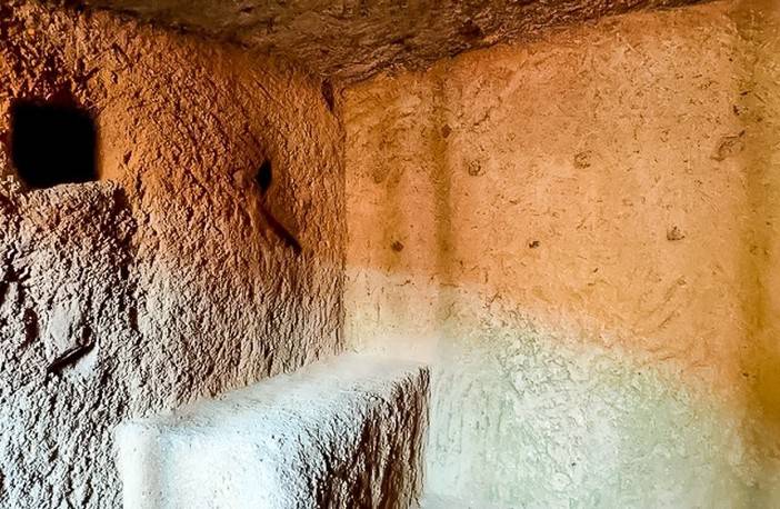 古崖居依其开凿的石室位置所形成的自然村落可以分成前、后两个区域。前沟南、北、东三坡凿有91处石室;后沟东坡一处凿有26处石室;这些石室的洞口毗邻,位置错落有序,石室一般高1.8米,呈长方形或正方形,其中以一明两暗的三套间居多。全部石室分布成楼层状,层与层之间有石蹬、石梯和栈桥相连。