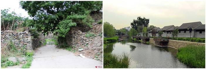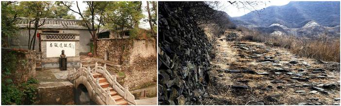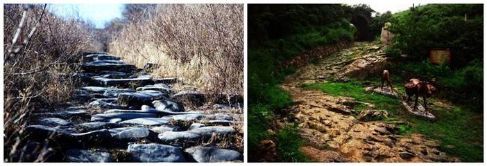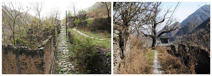 京西古道的徒步之旅从水峪嘴开始,穿村向西约20分钟便到达牛角岭关城。它是京西古老的“西山大道”上的重要关口,有“京西古道关城”之说。不过关城昔日辉煌早已消失,顶部爬满荆棘和野草的城券门洞,只剩下寂寞和苍凉。我们唯有从距关城西南不远处的“蹄窝”来追寻曾经的古老记忆。这些蹄窝凹陷在石头路面上,约摸百来个,大大小小深浅不一。京西群山中曾遍藏乌金,拉煤运货的骡马常年累月地往返于京城与西部山区,马蹄不断蹬踩踢踏,硬生生走出一路的石蹄窝,实乃奇观。穿关城一路西行,能看到古道旁不少的古遗址,三义庙、关帝庙及破败的碉楼。而著名的遗址是西落坡村的马致远故居,曾经荒废已久,2008年被翻修,然而当重新面对它修葺一新后的俊俏模样时,“枯藤老树昏鸦,小桥流水人家”,那份超然的意境却开始从心里慢慢消失。