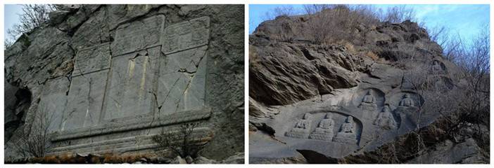 这段古道保存相当完好。古道的石板,每隔一米就会有道石板竖起来,可延缓水流冲刷路面,又可成为路者的踏脚处。拐过一山弯儿,古道戛然而止,往下是近乎90度的断壁。原来随着开采煤矿的大规模进行,一些唯利是图的人上山开采矿石,把古道破坏了。所幸当年在修建古道时,在岩壁上留下的四块摩崖石碑还在。