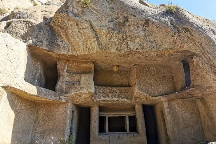 这里是古代人在陡峭的山崖上凿建的居所。在峡谷中一条不到10米宽的山沟两侧,距离谷底近10万平方米的陡峭花岗岩石壁上,遍布着人工凿刻的大小不同的石室。