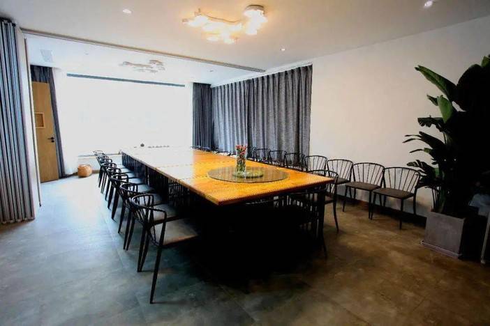 向右经过一个简单的西厨区域便是餐厅,餐厅里设置了品茶区,一旁两个相连的实木餐桌拼在一起,可以容纳近20余人就餐