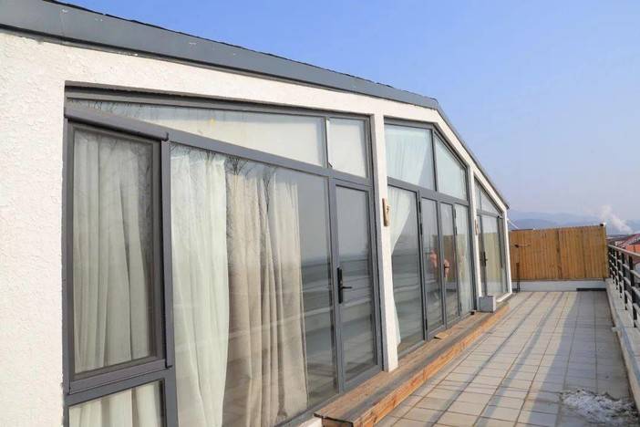 上到三层,这是一个户外区域。在屋顶露台上可以游泳,可以用餐。用木门作为隔断,分隔出两间顶层卧室,可以独享清静不被打扰。
