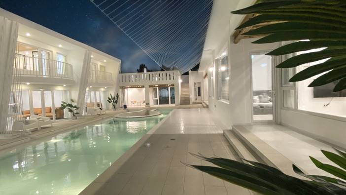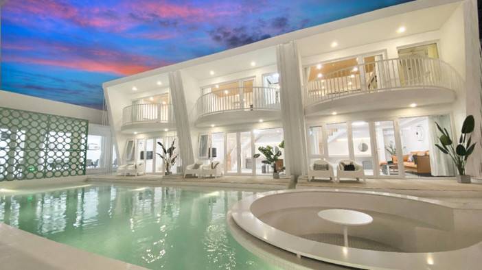 以纯白色调为主,泳池是淡淡的绿色,有种海盐风的韵味