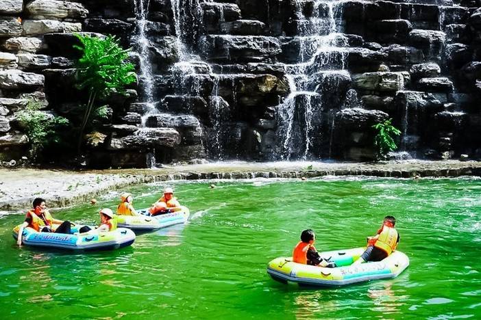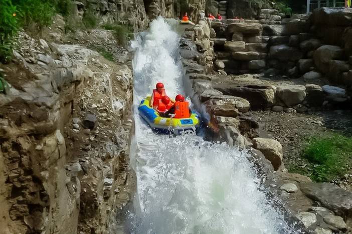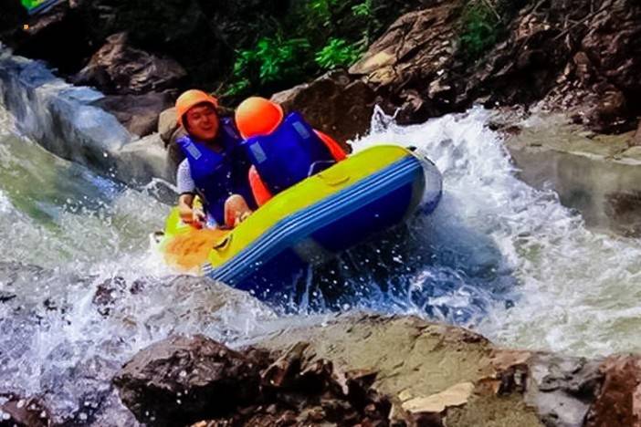 “两人一艇是最安全好玩的操作,体重较轻的在前。”工作人员说,“靠紧两头坐下,手握两侧把手……”按照指令,我们踏上橡皮艇,一屁股坐了下去,坐下去的那刻,瞬间的凉意让人咬牙切齿,但是还来不及喊叫,便被激流“哗”地一下冲了下去。漂流河道沿自然峡谷激流直下,全长约3.8公里,全程落差高达180米,全程布满大小湖泊10多个,拥有300多个极速叠差,漂流沿途惊险刺激的溶洞瀑布漂,廻旋漂,极速漂,时光穿梭漂,快乐逍遥漂等多种不同玩法,让你在开心快乐之时尖叫不断。