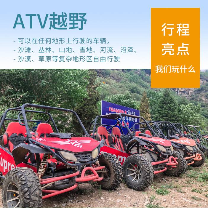 2)车辆:ATV穿越费用,越野驾控指导(穿越时间为1小时左右,路程为10公里左右);