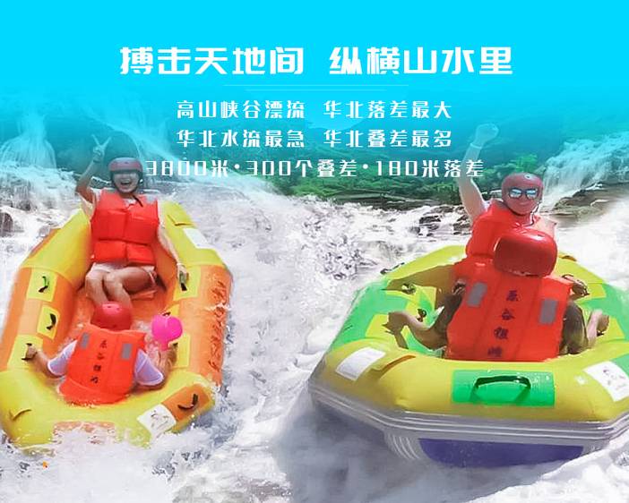 漂流河道沿自然峡谷激流直下,全长约3.8公里,全程落差高达180米,全程布满大小湖泊10多个,拥有300多个极速叠差,