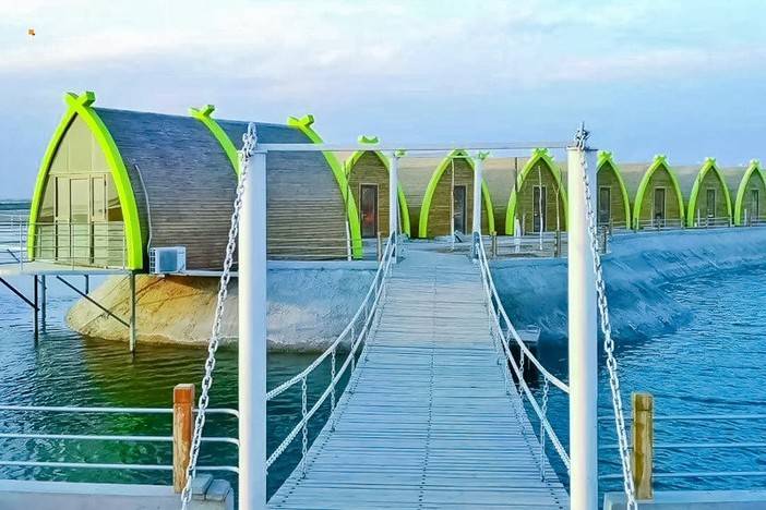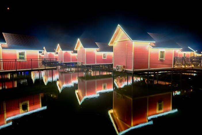 海上木屋 (距离水面2米左右,每个木屋间隔3-5米),那必须是漂亮呀,颜色好看,有粉红色,蓝色的,黄色的,还有原木色的(落地玻璃窗,空间较大),早起看到美女帅哥们打开窗户,开着门,站在门口拍照,别有一番风味。