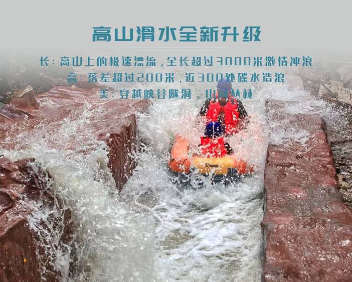 清凉谷高山滑水漂流项目全长超过3000米,落差高达200米,碟水造浪多达300处、途经4个戏水湖泊,是国内唯一一条穿越峡谷隧洞,山涧丛林,S弯滑道多达数十处的专业级高山滑水漂流赛道。