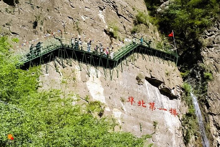 奇特的“三叠瀑布”落差115米,自女儿泉急流直下,水雾随风飘落,如银河般挂在峭壁上。“华北第一梯”倚峭而建,有“登云梯而览群山”之势。