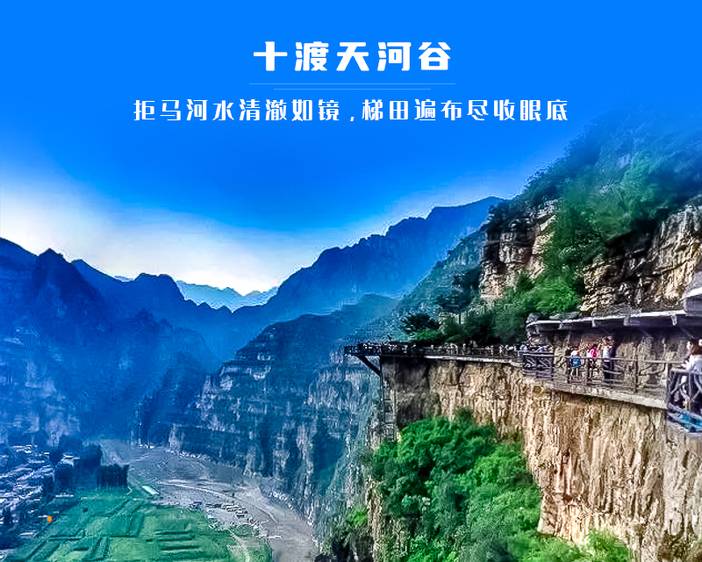 - 13.30天河谷景区游览,体验各种刺激项目。这里地貌很灵秀,悬崖峭壁很多,其间还有瀑布溪流等,下面的拒马河河水清澈,环境优美。誓言玻璃栈道依山所建,全长150米,落差300余米,70平观景礼佛台沿谷激流,高山滑水滑道全长2公里,落差178米,途中大型戏水池4个,激流叠差20余处,更有百米溶洞隧道、玻璃吊桥、玻璃栈道等,都值得你体验。