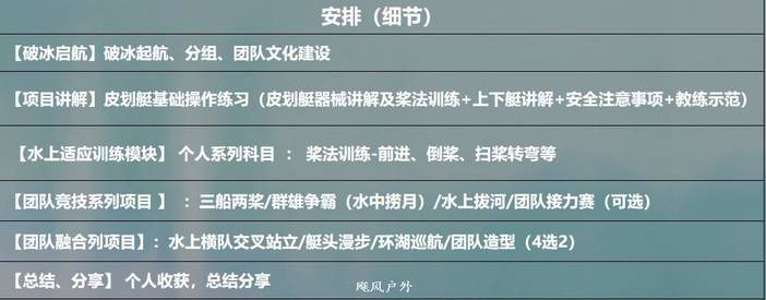 赛艇竞渡:分成若干小组进行竞赛,组与组之间进行竞赛。艇头漫步:听从教练指挥,艇扎成一个长艇排,队员依次从艇的一端走到另一端,然后还可以来个帅帅的花式跳水。