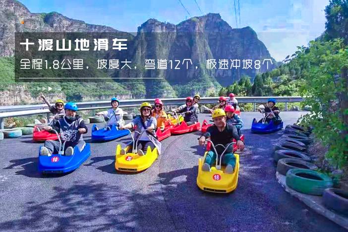 十渡山地滑车全长1.8公里,直径落差380米,最高时速20KM/小时,位于十渡核心地区八渡村附近。