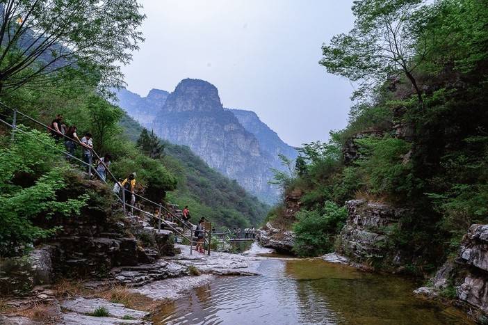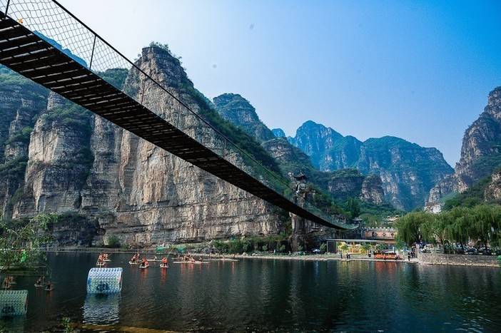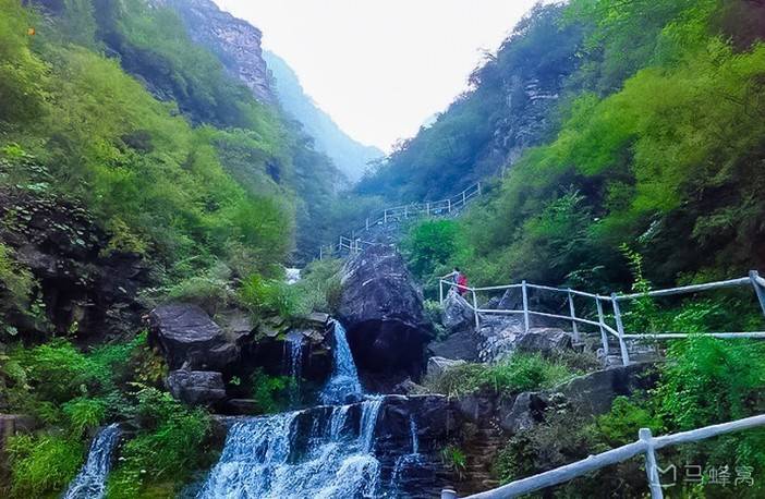 奇特的“三叠瀑布”水流分三叠落差,直流急下,瀑水入潭击石飞溅。“华北第一梯”倚峭而建,工程险峻,