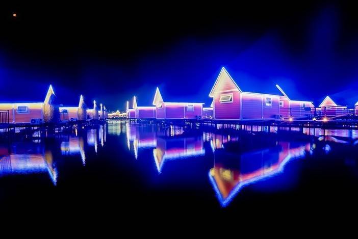 悠闲漫步于木屋群,多彩木屋与灯光、水光倒影相得益彰,夜色迷人......大家可以数星星、扑克牌狼人杀等、喝小啤酒聊人生,今夜注定无眠……