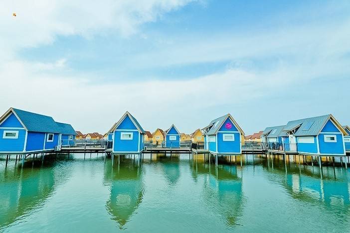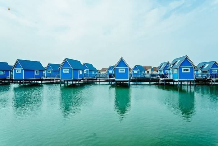 海上木屋 (距离水面2米左右,每个木屋间隔3-5米),那必须是漂亮呀,颜色好看,有粉红色,蓝色的,黄色的,还有原木色的(落地玻璃窗,空间较大),早起看到美女帅哥们打开窗户,开着门,站在门口拍照,别有一番风味。