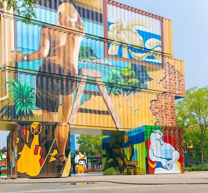 花间集小镇,是由25个集装箱组成的创意集市,箱体上都有独具特色的张小盒(Mr. BOX)彩绘。每一个集装箱里都是一独立的小店,而“迷宫”的概念设计是,游客只要找对一家小店的出入口,就能从一个小店逛遍所有店铺。