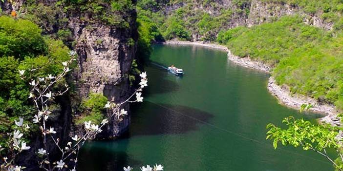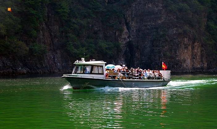 然后乘龙梯上到大坝顶,坐船游览龙庆峡,从金刚寺码头下船,游览金刚寺景区,然后从月亮湾码来头上船,回到百花洞口,