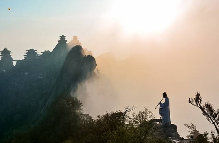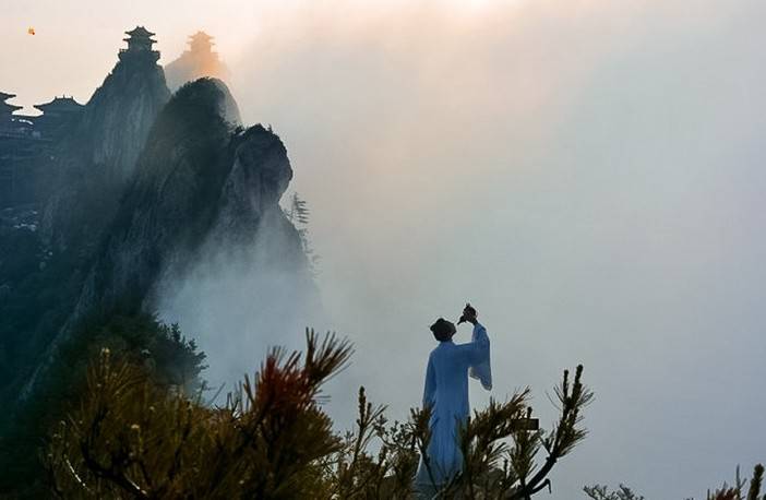 奇峻的峰岭,嶙峋的怪石,静谧的栈道,清幽的道观,悠悠大山,万象归一,清雅幽静之中,象老子所留下的五千箴言,象李白杜甫晚年的诗歌,返璞归真、铅华洗尽,那深绿环绕红叶点缀的山峰,远远望去,甚至有些出人意料的素朴,有些出人意料的简约。
