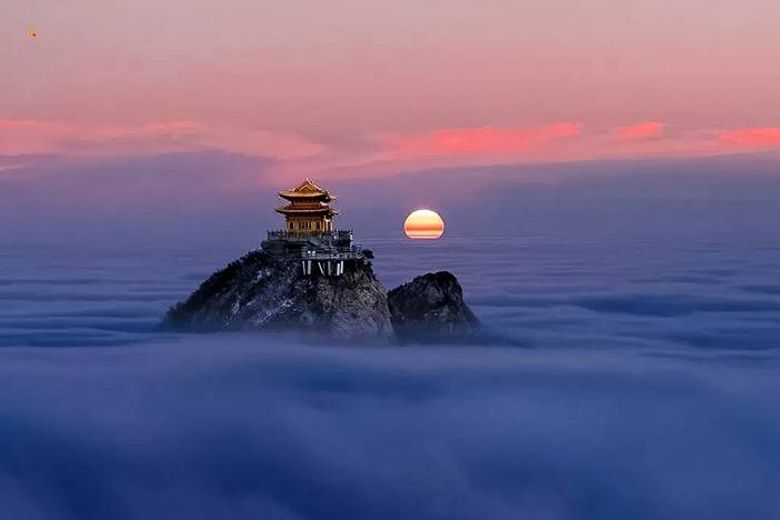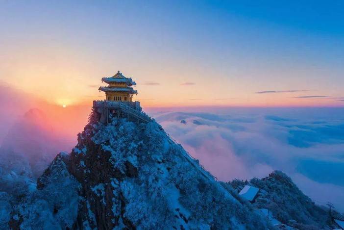 冬雪与松、石、云巧妙结合,配以晶莹冰挂、琉璃雾凇、宏伟金殿,将老君山装扮成绝美的人间仙境。