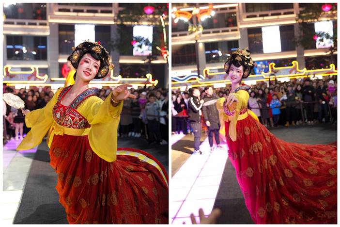 亮点5:网红。大唐不夜城是西安网红高地,不倒翁小姐姐,凿石头的小哥哥,变色的灯带,喷泉之类的,网红打卡点一直在更新。步行街有几个小型场地,晚上会有一些演出表演。