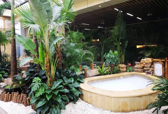 唯美的热带雨林馆拥有动感水疗池、木桶原汤泉、名花汤泉、鱼疗池、瓜果汤泉、蔬果美容汤泉等特色泡池。