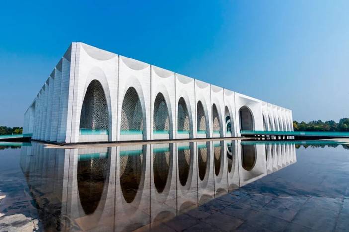 水系将建筑与周围场地隔离,形成一座文化之岛。整体造型寓意“东方明珠”,而建筑主体则恰如一颗融合了中华民族文化的明珠,镶嵌在大厂这片沃土之上。每当华灯初上,主体建筑流光四溢、璀璨夺目。建筑造型大气凝练,气势恢宏,体现了中华民族包容创新与自强不息的核心价值。在建筑基座周围有精美隽秀的花瓣式门洞形成的柱廊空间,象征56个民族团结共荣。