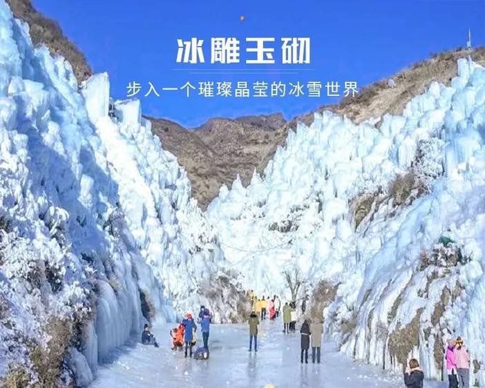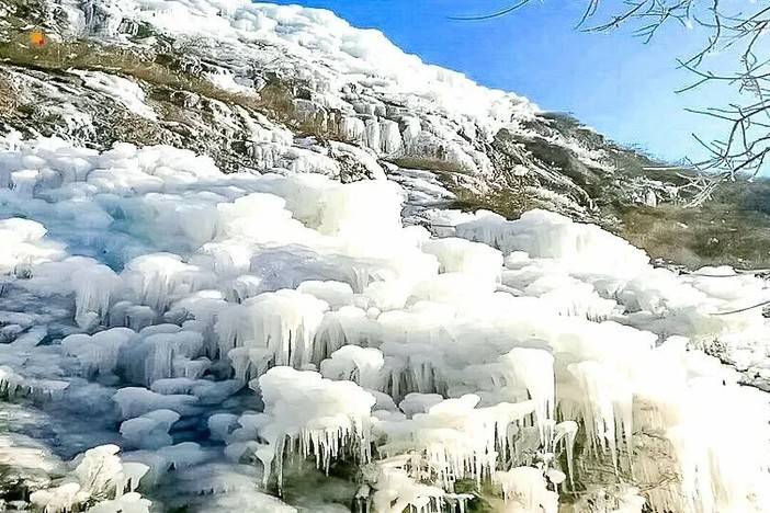 云瀑沟冰瀑是京郊冬日必打卡的自然奇观,核心亮点十足。冰瀑依山势蜿蜒垂落,百米高的 “珍珠帘” 与雪莲花般的冰雕形态各异,在阳光照射下折射璀璨光芒,蓝天映衬下的蓝冰更显梦幻。