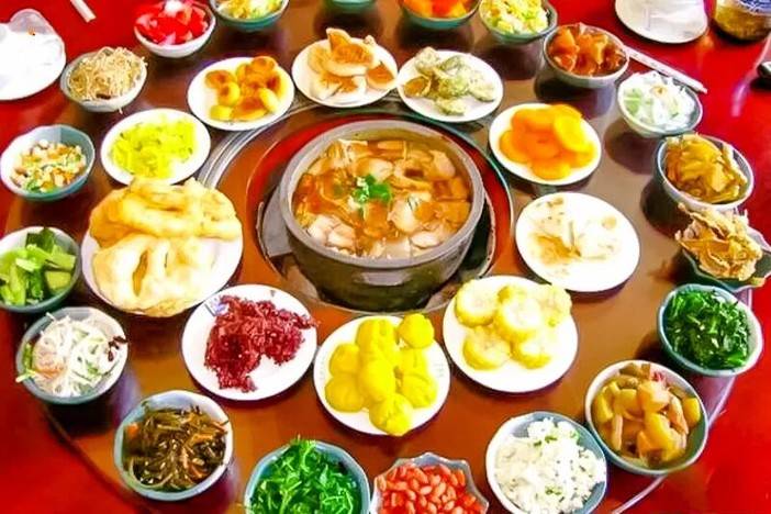 制作时以一主锅为主,放入五花熏肉、白菜、鲜豆腐、冻豆腐、炸豆腐等。