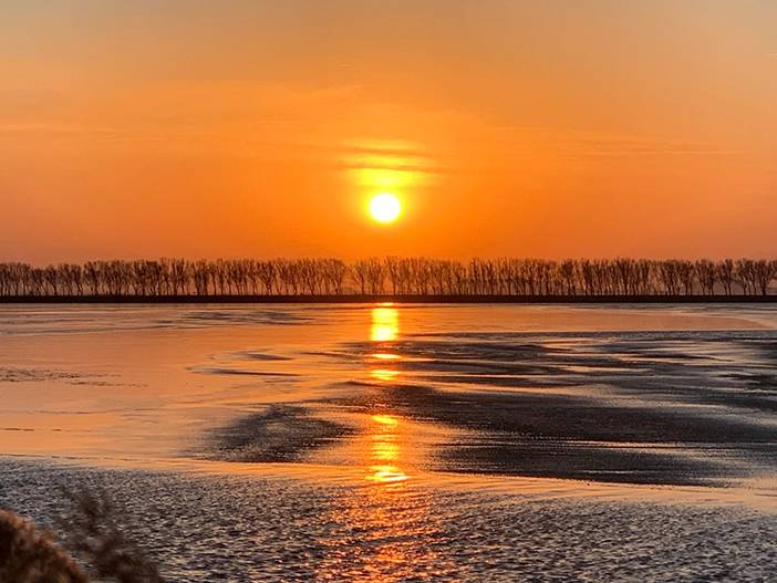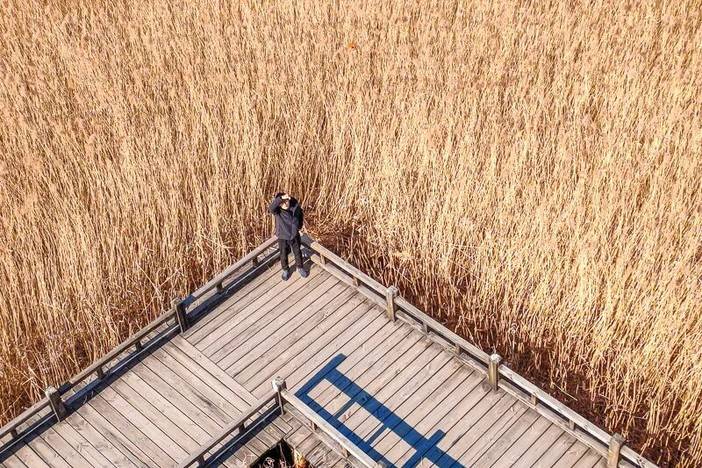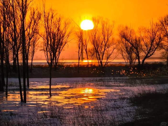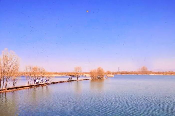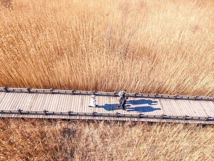- 13:00|往往野鸭湖湿地公园后,自由活动。徒步环湖全程约6公里,不紧不慢时间正好;有湖中木栈道,穿梭在大片的芦苇荡中央;也有林荫小路,随时休憩;湖面半冰半水,靠近岸边是晶莹剔透的薄冰,湖心则是缓缓流动的碧水,冰水交界处纹理精巧。周边的芦苇荡呈现出金黄、赭石等暖色调,苇穗随风起伏,与远处黛青色的山峦相映成趣。初雪过后,芦花覆雪,木栈道也被染成白色,踩上去发出咯吱声。此时,灰鹤、豆雁等候鸟在此栖息、觅食,为冬日的湿地增添了生机。