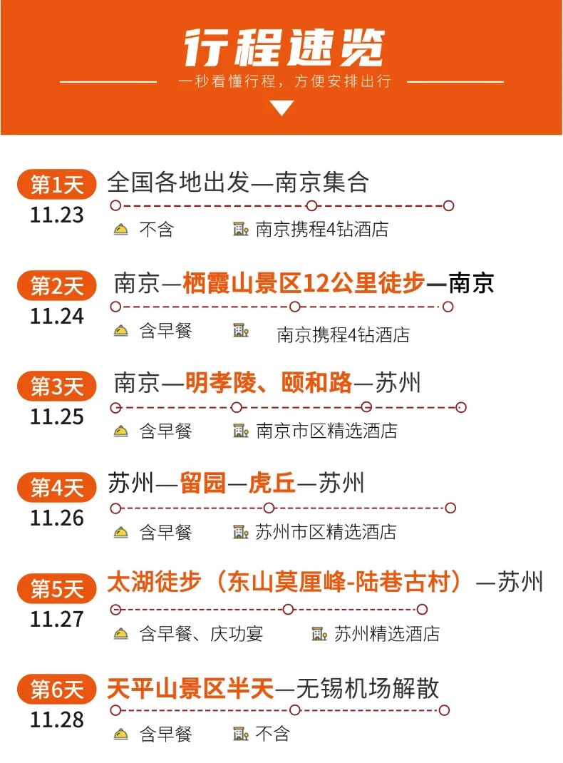 2.住宿:南京精选酒店2晚、苏州精选酒店3晚;3.餐食:五天早餐,不含正餐;